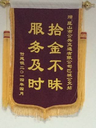 4月26日,一位乘客將一面錦旗送到巴城客運站二分調度室,感謝拾金不昧駕駛員。原來在4月11號,失主乘坐117路蘇EP6021王雪良師傅的車時,不慎將皮包忘在車上