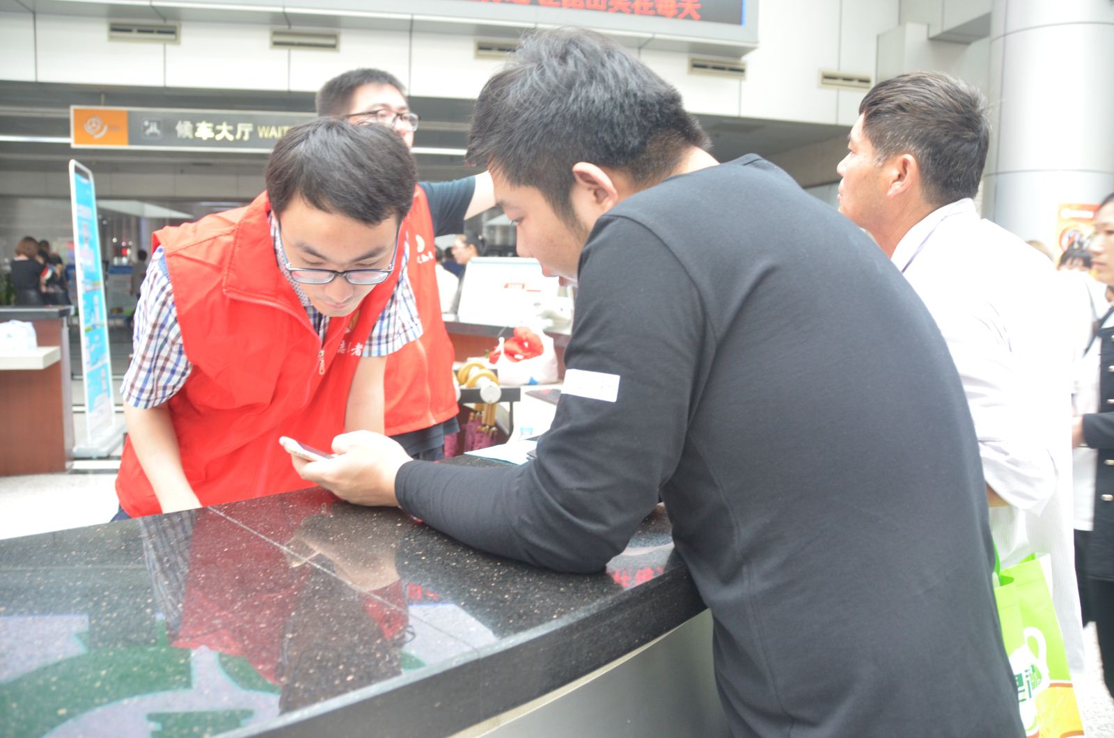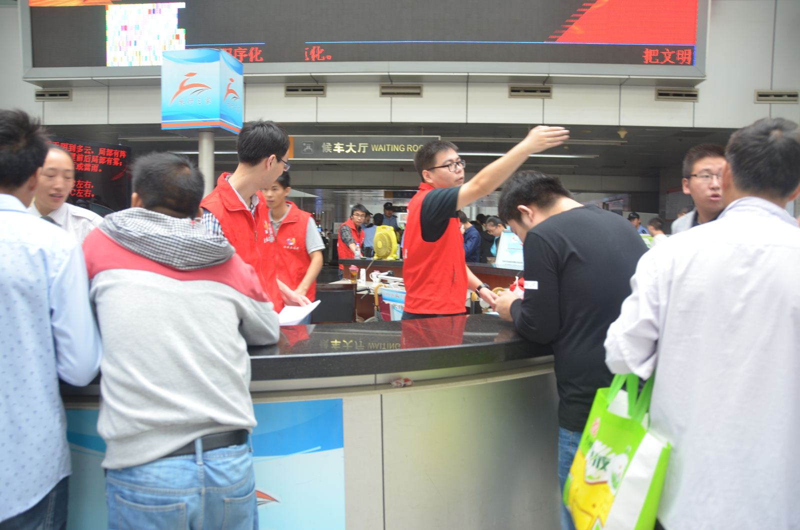 公交青年志愿者在汽車南站服務(wù)臺幫助有需要的乘客進行長途汽車乘坐服務(wù)咨詢。