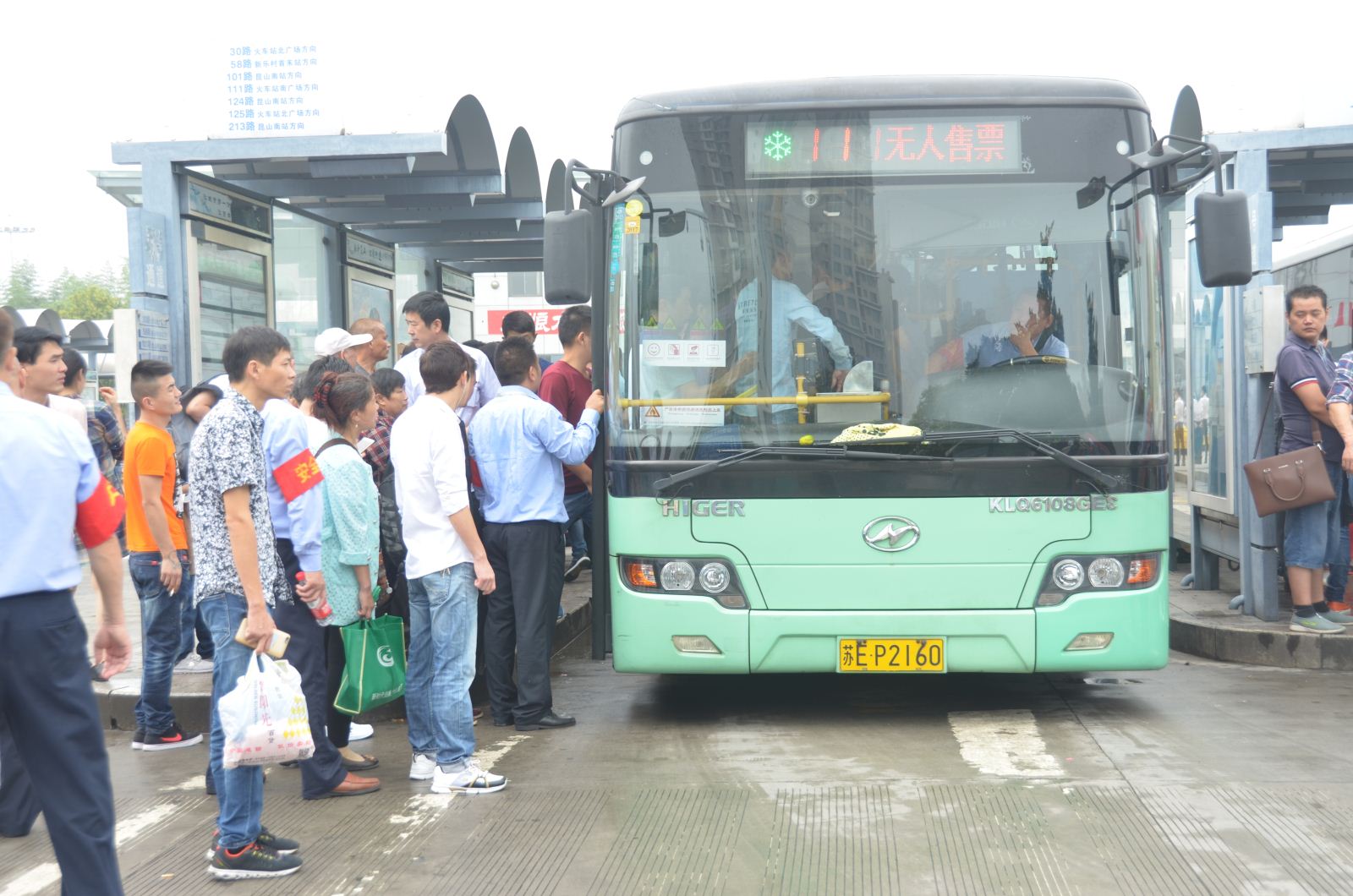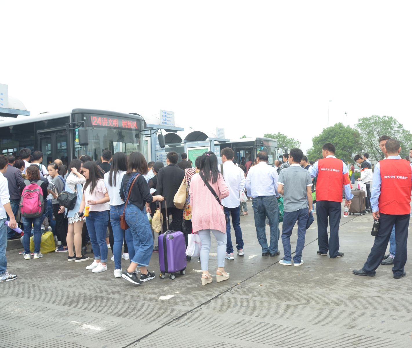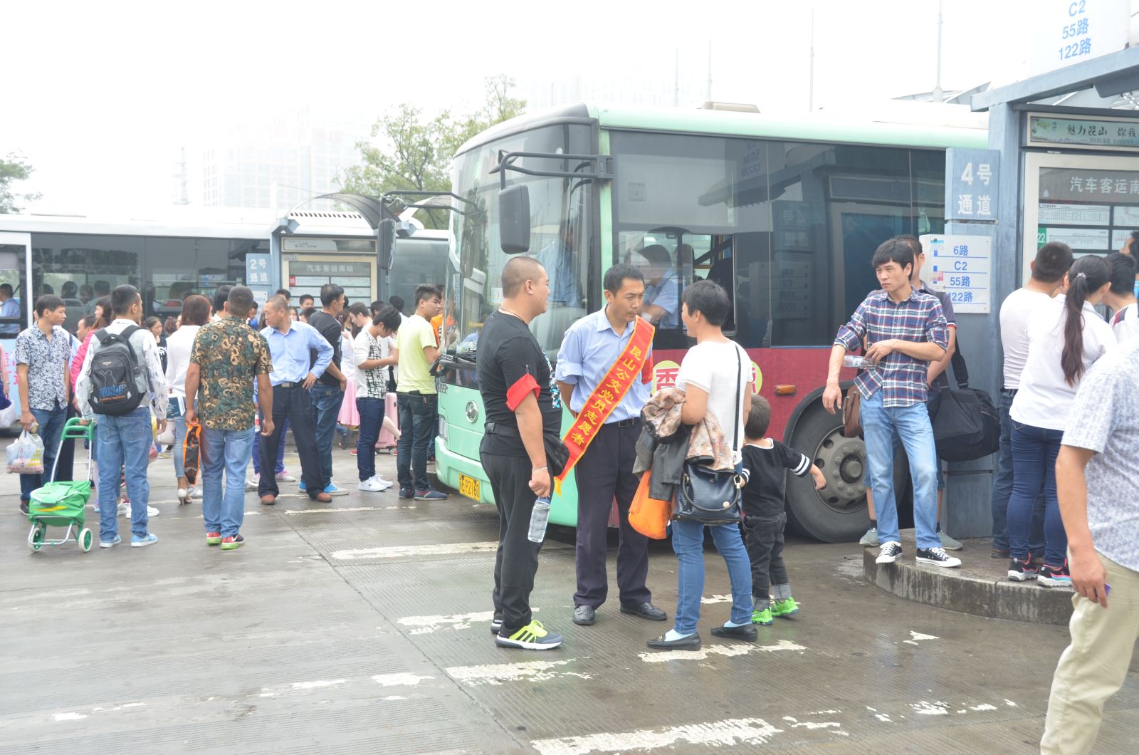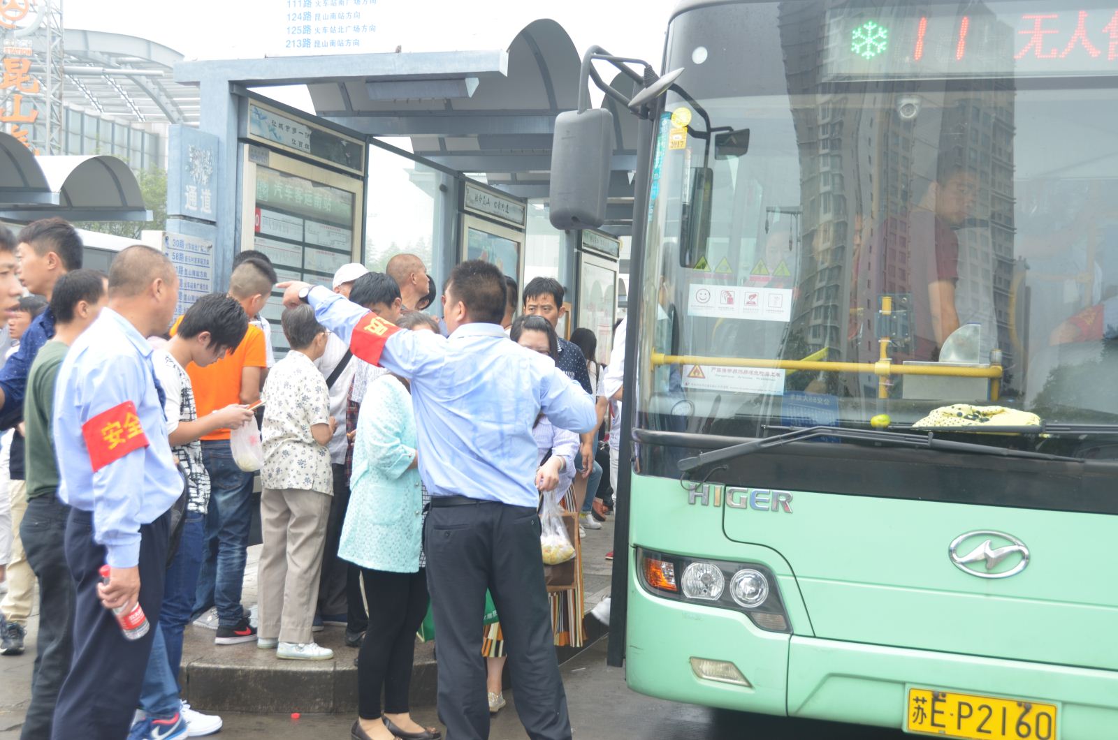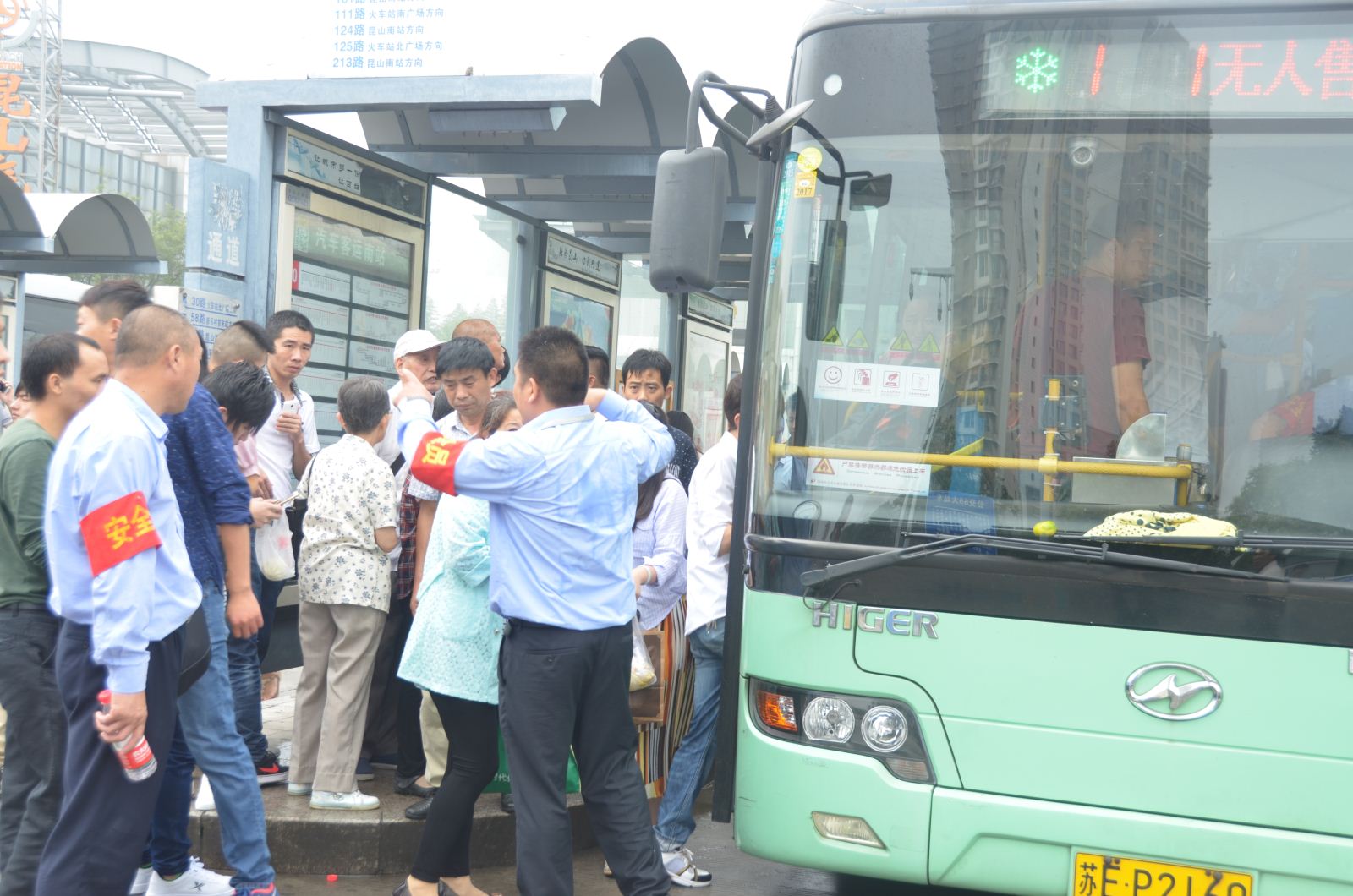安全員汗流浹背的幫助乘客們有序上車,并在間隙回復(fù)乘客乘車線路咨詢。
